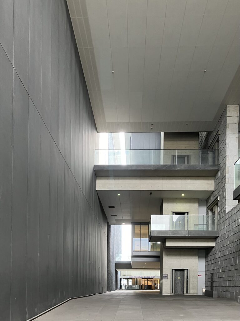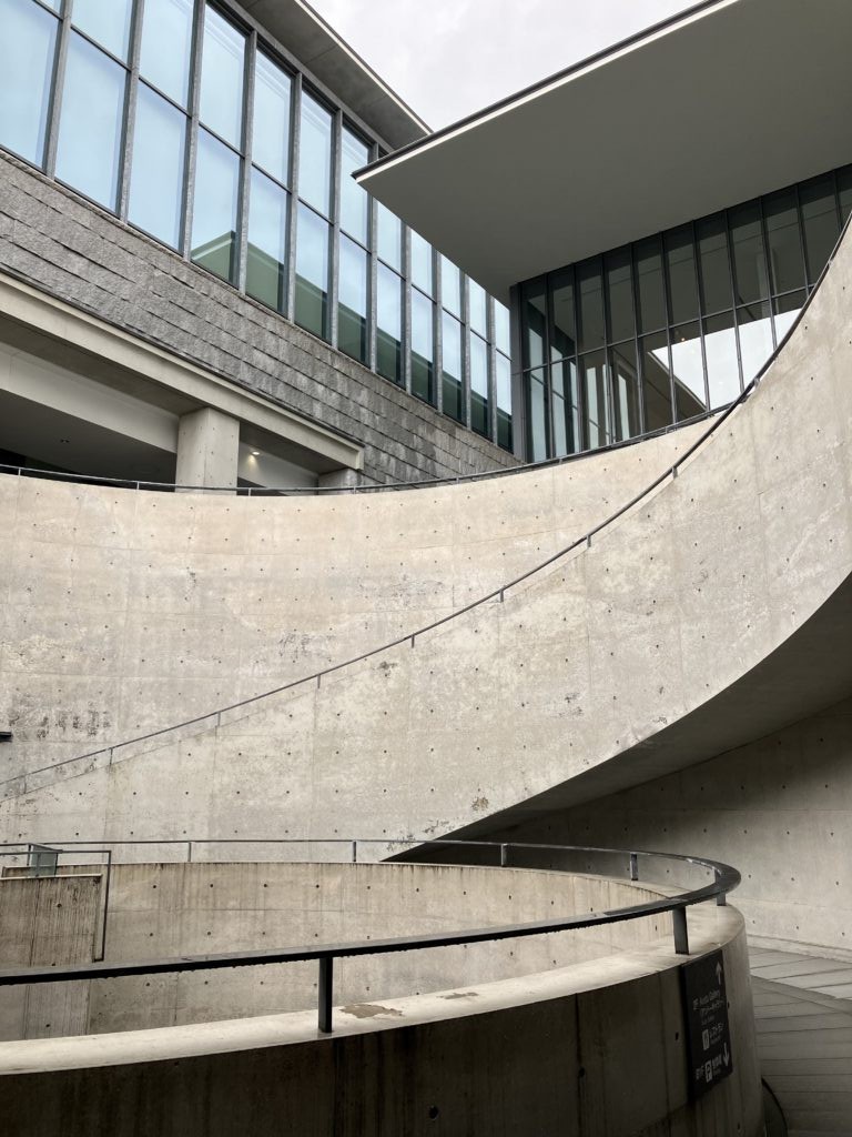 階段の滑らかな曲線におもわずうっとり。この階段を昇り降りするする人を見ると、その人も芸術作品の一部になったかのようでした。見上げたときにガラス張りのボリュームと大きくせり出した軒が見えるのもいいですね。