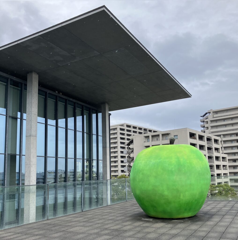 人の背丈よりも大きい青りんごは、遠くからも目を引くこの建築の象徴のようになっていました。