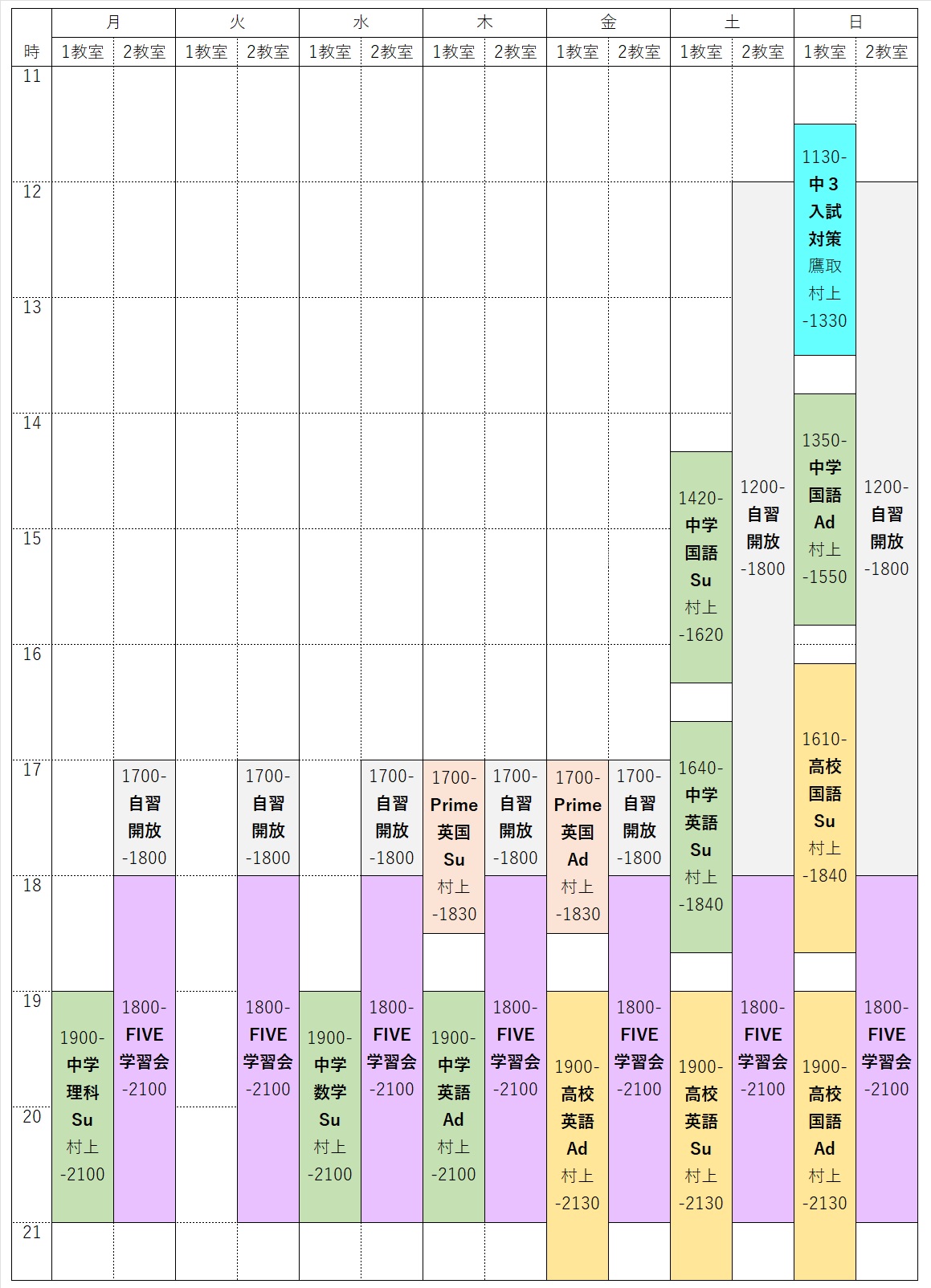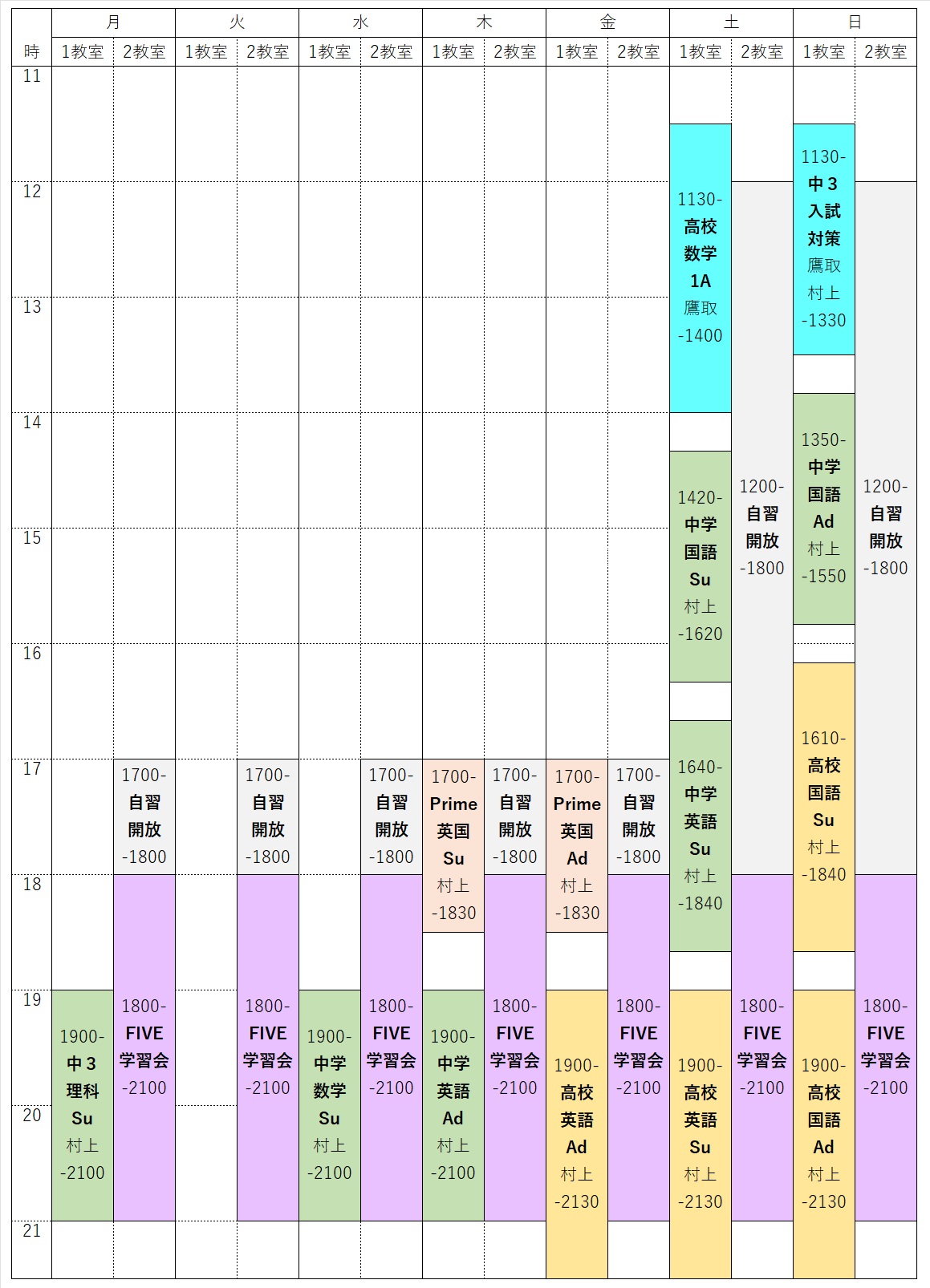この時間割に記載のないクラス授業については、すべて映像授業にて受講いただくことができます。 (ホームルームタイム、FIVE学習会、Web配信いずれかを利用)
